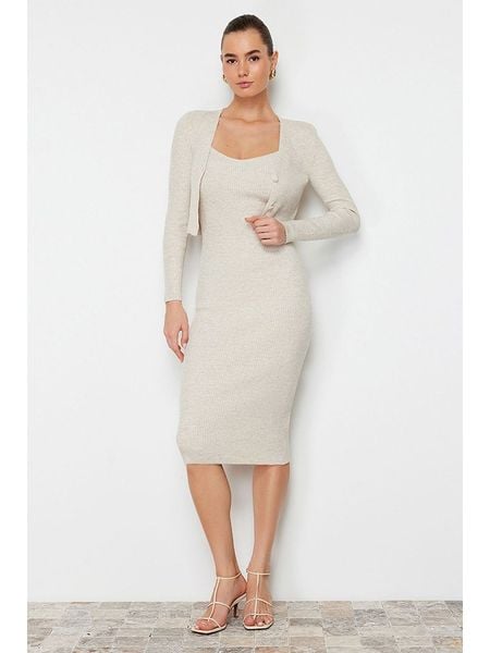 W zestawie:Kardigan:- dekolt: V- zapięcie: listwa guzikowa- krój: cropped- look: jednokolorowySukienka:- ramiączka: regulowane- dekolt: V- krój: wąski- look: jednokolorowy