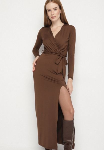 Brązowa Sukienka Kopertowa z Wiskozą Zdobiona Rozcięciem i Wiązanym Paskiem Teslea