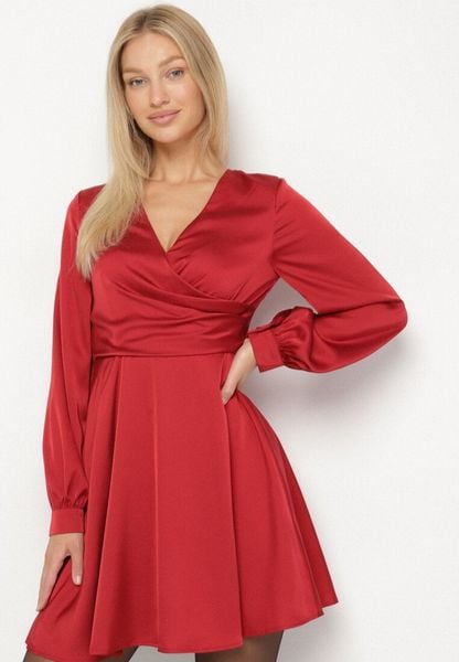 Czerwona Satynowa Sukienka VICES z Kopertowym Dekoltem i Bufiastymi Rękawami Nivita