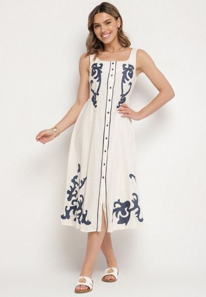 Beżowa Sukienka z Bawełny Ozdobiona Haftami i Guzikami Milarietta
