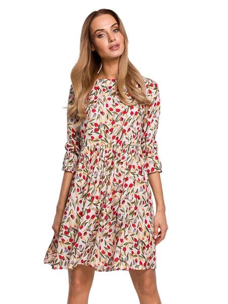 – czysta wiskoza- dekolt: łódka- długość rękawa: 3/4- ściągacz: zakończenia rękawów- krój: litera A- wzór: kwiatowy