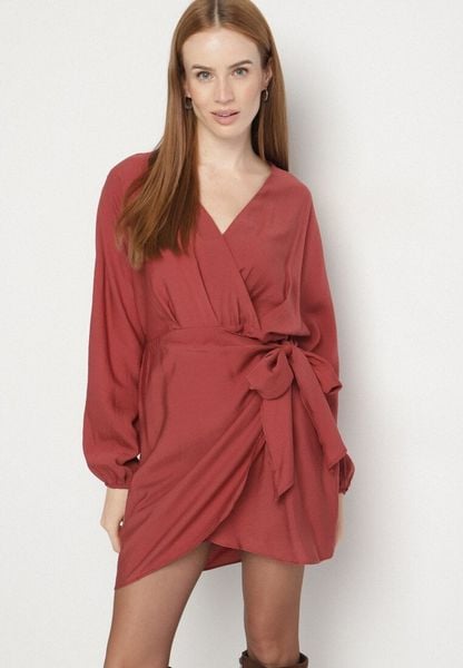 Czerwona Wiskozowa Sukienka Kopertowa z Wiązaniem i Bufiastymi Rękawami Onevia