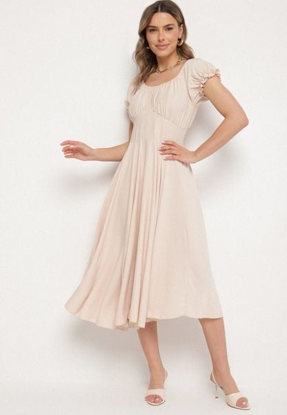 Beżowa Sukienka z Bawełną Typu Hiszpanka z Ozdobnymi Bufkami Lunaleia