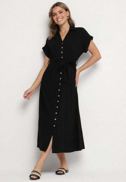 Czarna Sukienka z Bawełny o Koszulowym Kroju z Wiązanym Paskiem Elanitiela