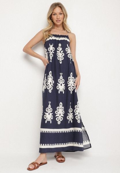 Granatowa Sukienka o Rozkloszowanym Kroju na Ramiączkach w Etniczny Wzór Revoniae
