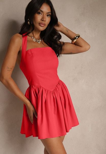 Czerwona Sukienka Vices o Rozkloszowanym Kroju Ozdobiona Paskiem na Szyję Addiana