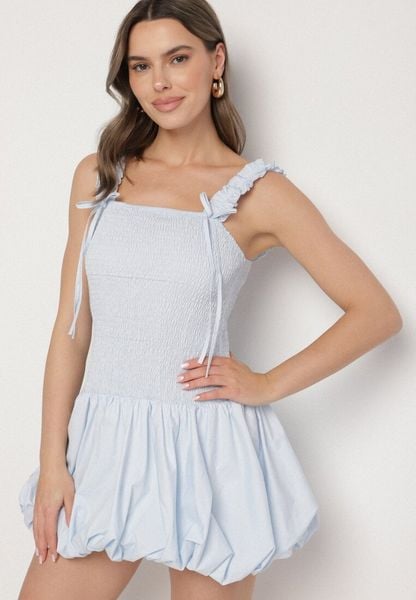 Jasnoniebieska Bawełniana Sukienka Bombka na Ramiączkach z Elastyczną Górą Linarisena