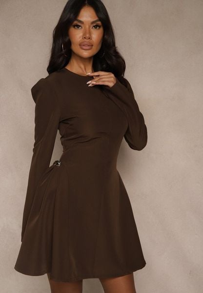 Brązowa Sukienka o Rozkloszowanym Kroju z Ozdobą z Boku Eleslia