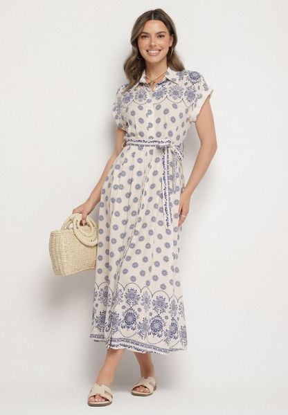Beżowo-Niebieska Koszulowa Sukienka z Wiskozy w Kwiatowy Wzór z Wiązanym Paskiem Iffinara