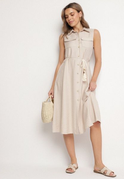 Beżowa Koszulowa Sukienka z Wiskozy o Rozkoszowanym Kroju Wiązaniem z Frędzlami Zenbia