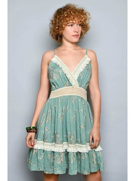 – dekolt: V- ramiączka: wąskie- detale: szydełkowana koronka- krój: rozkloszowany- wzór: na całości