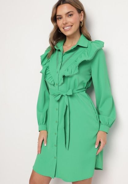 Ciemnozielona Koszulowa Sukienka z Falbanką i Wiązanym Paskiem Jituri