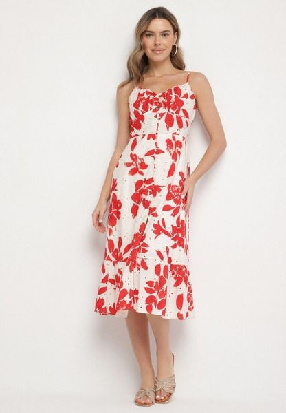 Czerwona Ażurowa Sukienka z Bawełny o Rozkloszowanym Kroju na Ramiączkach Nitaria