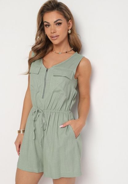 Zielony Taliowany Bawełniany Kombinezon z Gumką w Pasie Zapinany na Suwak Tennea