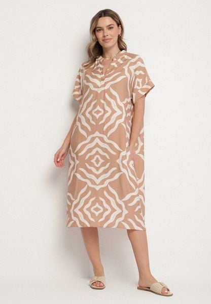 Beżowa Sukienka z Lnem i Wiskozą Ozdobiona Geometrycznym Motywem Sadeele