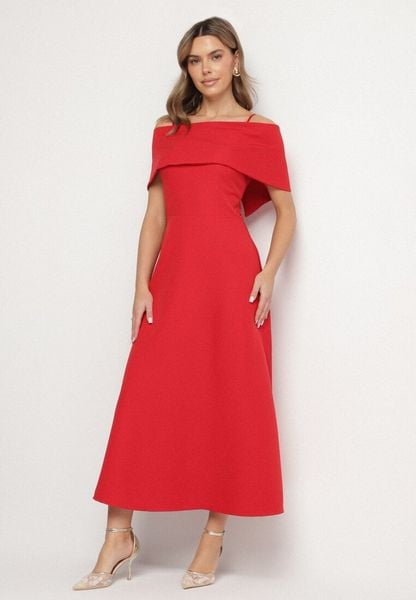 Czerwona Sukienka o Rozkloszowanym Kroju na Ramiączkach z Wywijanym Dekoltem Jenathia