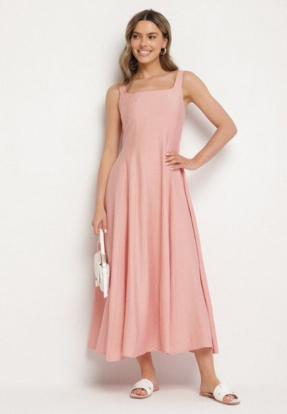 Różowa Wiskozowa Sukienka o Rozkloszowanym Kroju z Kwadratowym Dekoltem Avmila