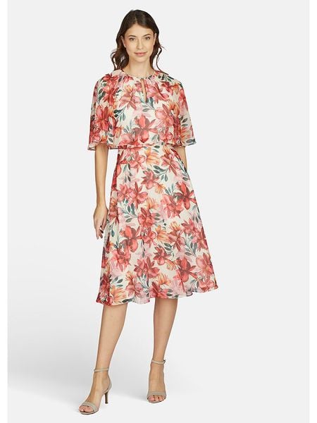 – dekolt: okrągły- zapięcie: guzik na plecach- krój rękawów: nietoperz- krój: litera A- wzór: kwiatowy