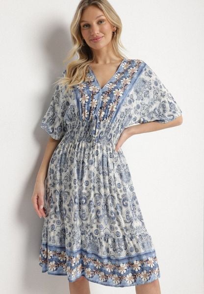 Granatowa Sukienka z Wiskozy w Ornamentalny Wzór z Szeroką Gumką w Pasie Tanissla