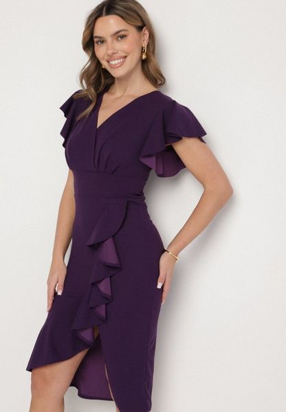 Fioletowa Dopasowana Sukienka z Kopertowym Dekoltem i Falbankami Leolani