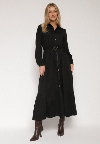 Czarna Wiskozowa Koszulowa Sukienka o Rozkloszowanym Kroju z Paskiem Retirna