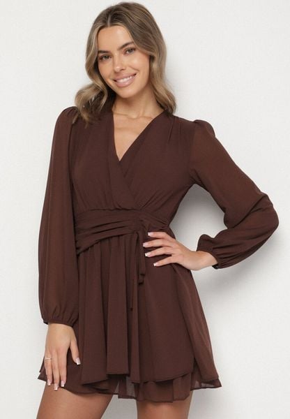 Brązowa Rozkloszowana Sukienka z Siateczki z Kopertowym Dekoltem Zenessa