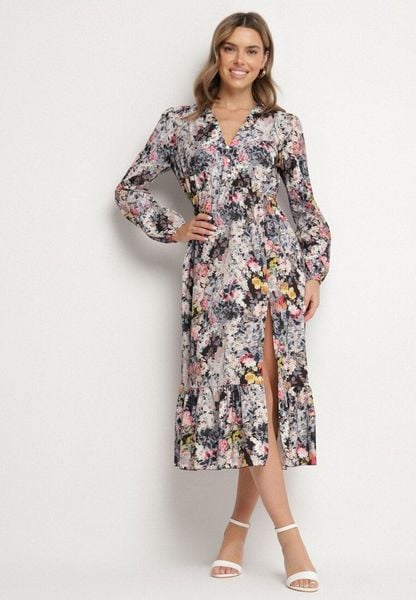 Czarna Rozkloszowana Sukienka w Kwiaty z Dekoltem w Serek i Gumką w Talii Janitra
