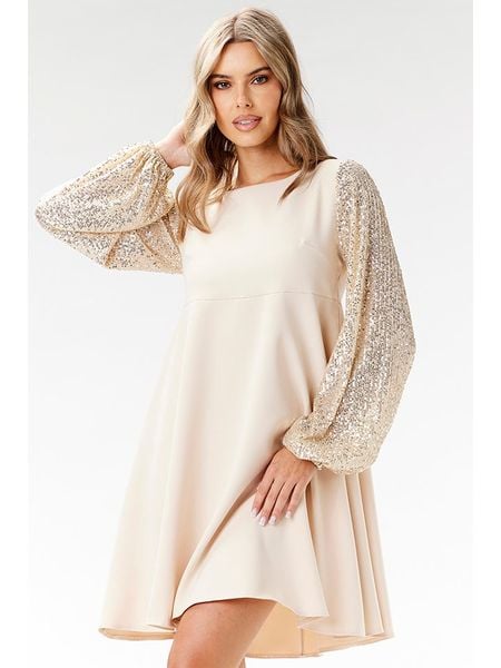 – dekolt: okrągły- rękaw: bufiasty- zakończenie rękawów: elastyczne- detale: cekiny- krój: rozkloszowany- look: jednokolorowy