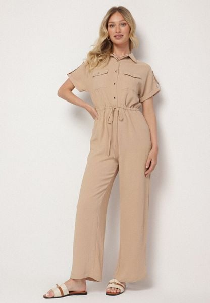 Beżowy Kombinezon o Koszulowym Kroju z Krótkim Rękawem i Wiązaniem w Talii Mareriela