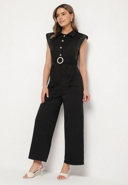 Czarny Taliowany Kombinezon z Guzikami i Cyrkoniami Lumalise