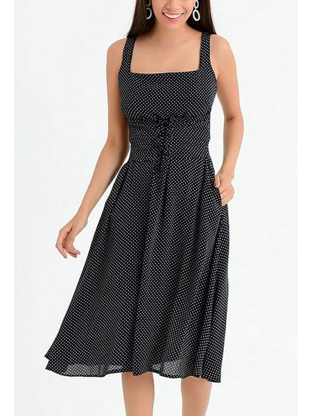 – ramiączka: wąskie – dekolt: karo- w talii wiązanie: tak – krój: luźny- wzór: kropki