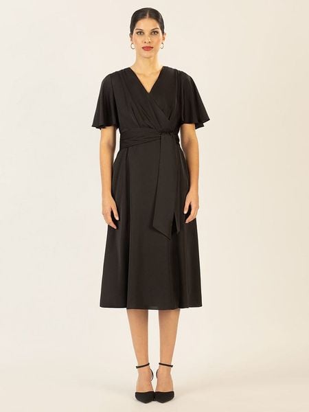 – dekolt: V- zapięcie: suwak na plecach- krój rękawów: motylek- zdejmowany pasek: tkanina- kieszenie: wpuszczane- krój: litera A- look: jednokolorowy, imitacja satyny