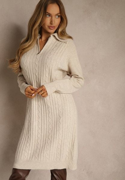 Jasnobeżowa Sweterkowa Sukienka z Bawełną i Wełną Ozdobiona Suwakiem Reinda