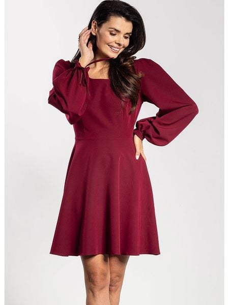 – dekolt: okrągły- zapięcie: suwak na plecach- krój rękawów: bufiasty- zakończenia rękawów: wiązanie- krój: litera A- look: jednokolorowy
