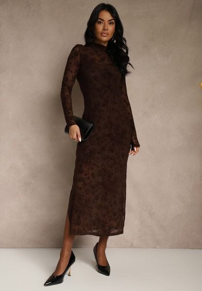 Brązowa Sukienka z Domieszką Wiskozy Ozdobiona Welurowym Nadrukiem Vetionne