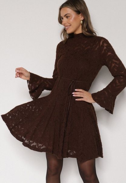 Brązowa Koronkowa Sukienka z Wiązaniem Półgolfem i Falbankami Alnefera