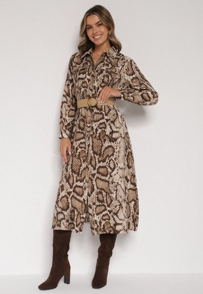 Brązowa Sukienka Koszulowa z Wiskozą Zdobiona Paskiem i Wzorem w Węża Delane