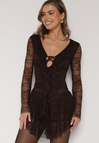 Brązowa Koronkowa Sukienka Wieczorowa z Wiązaniem przy Dekolcie Ferolena