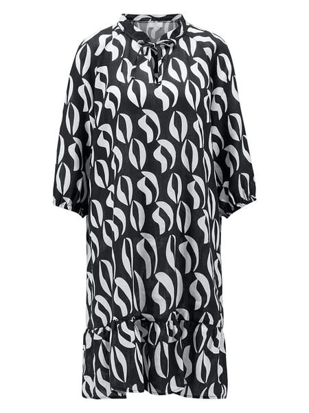 – czysty len- kołnierz: stójka- dekolt: z rozcięciem- długość rękawa: 3/4- zakończenie rękawów: elastyczne- dolny brzeg: z falbankami- detale: ozdobne wiązanie- krój: prosty- wzór: na całości