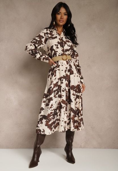Brązowa Sukienka z Wiskozą o Koszulowym Kroju z Paskiem w Krowie Łaty Carlitia