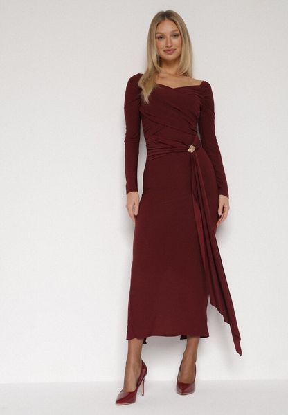 Bordowa Dopasowana Sukienka z Ozdobnym Marszczeniem Trenem i Rozcięciem Alutria