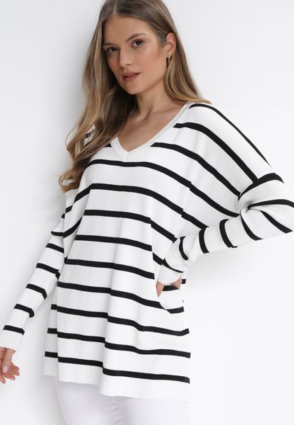 Biało-Czarny Oversizowy Sweter w Paski z Trójkątnym Dekoltem Darivia