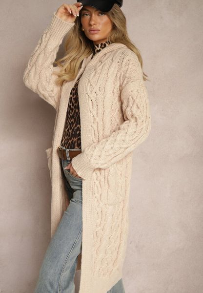 Beżowy Kardigan z Tłoczonej Dzianiny z Wełną i Wiskozą z Kapturem i Kieszeniami Vaileth