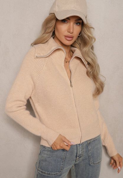 Beżowy Kardigan z Wełną o Kroju z Golfem i Zapięciem na Zamek Zinfria