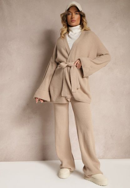 Beżowy Sweterkowy Komplet Kardigan z Wiązaniem i Szerokie Spodnie Edionisa