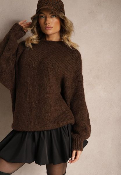 Brązowy Klasyczny Sweter z Wełną i Wiskozą o Luźnym Kroju Omethea