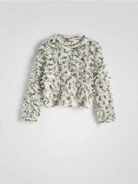 Sweter o prostym kroju wykonany z dzianiny z wełną.