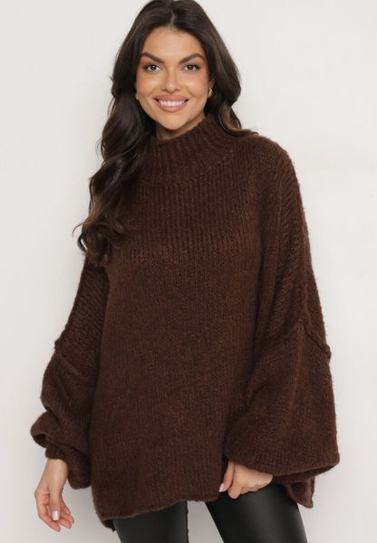 Brązowy Golf z Wełną o Kroju Oversize z Obniżoną Linią Ramion Lilenae