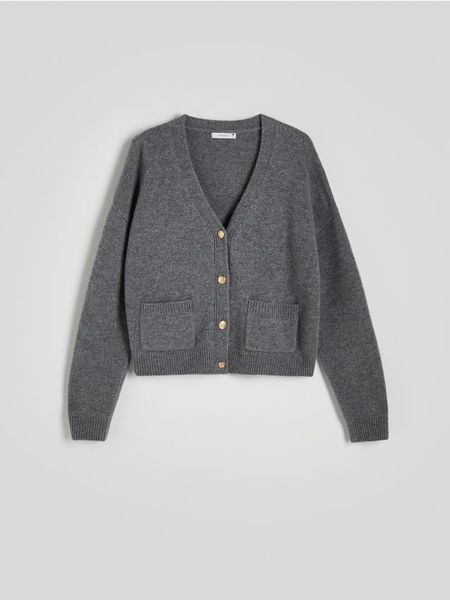 Kardigan o swobodnym fasonie, wykonany z wełnianej dzianiny.