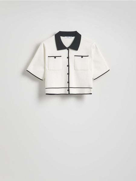 Sweter o koszulowym kroju, wykonany z gładkiej tkaniny z dodatkiem wiskozy.